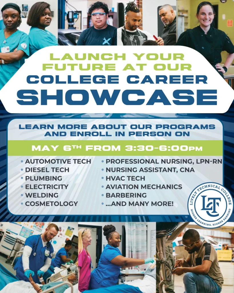 Join us on Tuesday, May 6th from 3:30–6:00 PM at the Lively Technical College Main Campus to explore over 30 hands-on, high-demand career training programs. Whether you’re interested in healthcare, skilled trades, culinary arts, or aviation mechanics, our programs are designed to get you career-ready—fast.