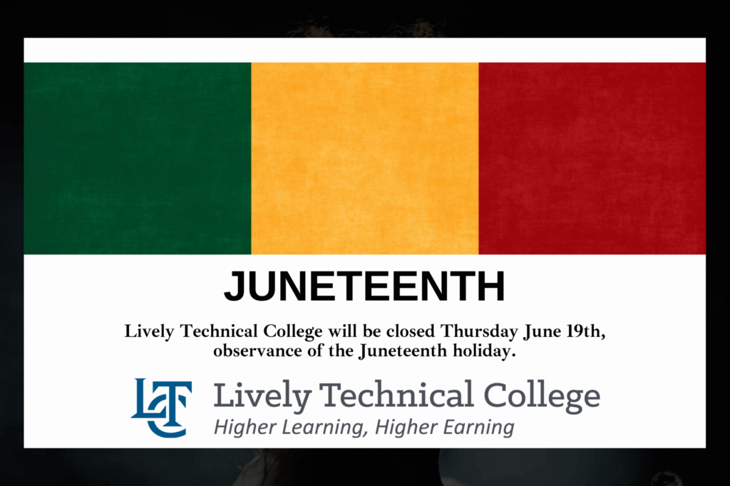 Lively Technical College will be closed Thursday, June 19th, observance of the Juneteenth holiday.